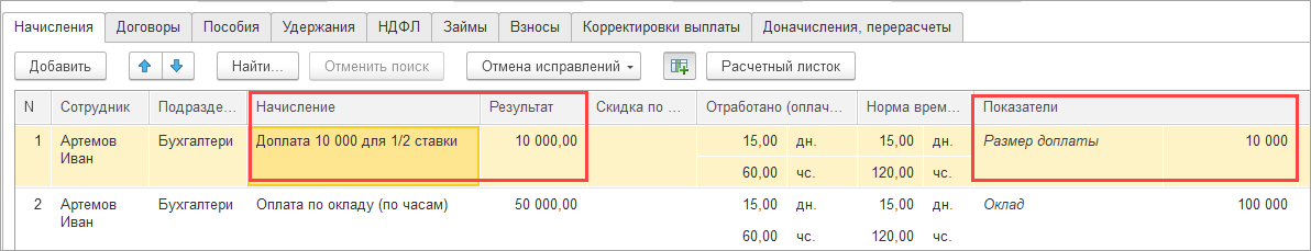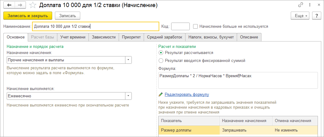 2. Если же нужно чтобы расчет был пропорционально отработанным часам , то можем настроить отдельное начисление, например «Доплата для 1/2 ставки» у задать для данного начисления формулу в начислении доплаты: РазмерДоплаты * 2 / НормаЧасов * ВремяВЧасах