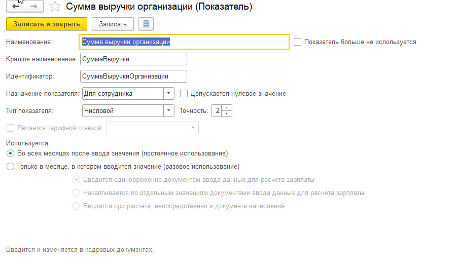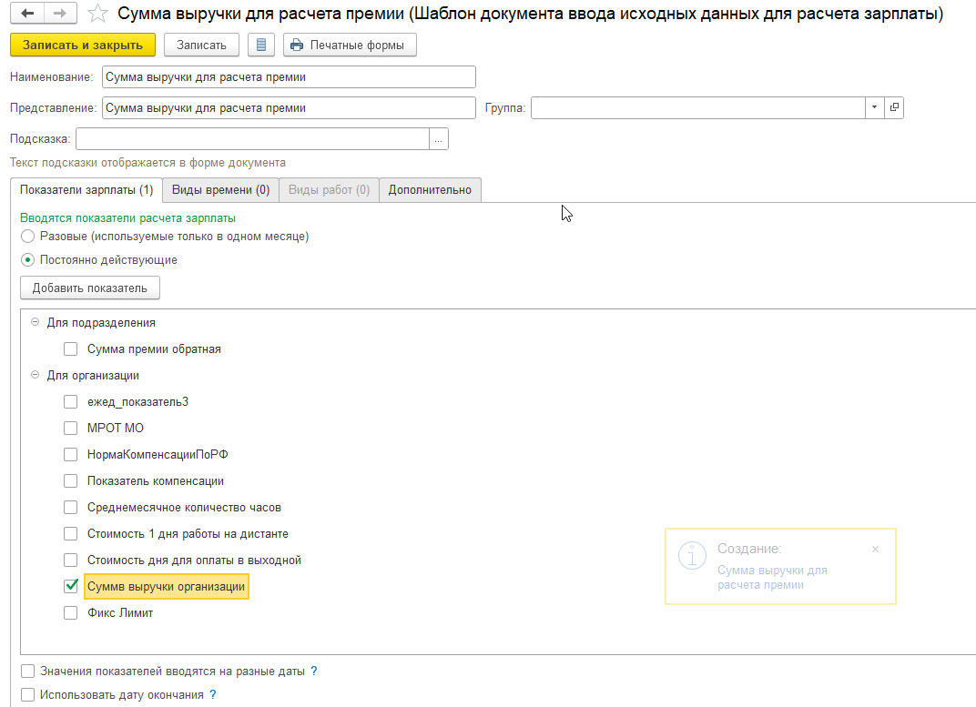 1) Создаем новый показатель (Настройки -Показатели расчета зарплаты). Параметры показателя на скриншоте: