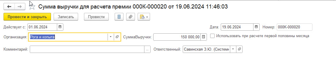 появляется 2-е строчки начисления Переменная часть от выручки. Сумма не та. Выручка 50000 * 0,5% = 250. Так должно быть. Ну и сумма за выходные …