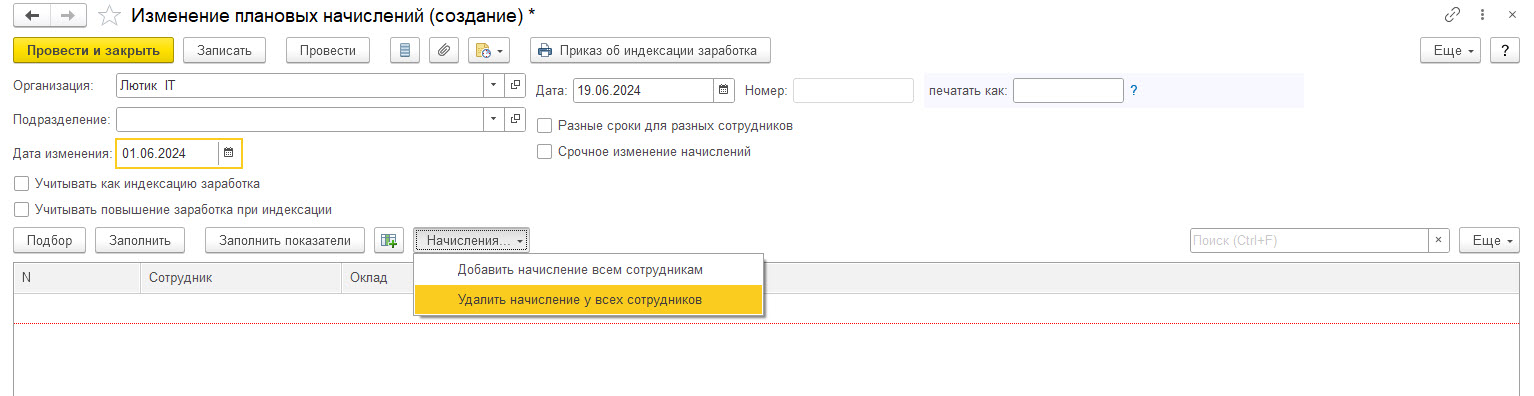 4) Отменяем плановое начисление для сотрудников. Это можно сделать с помощью документа Изменение плановых начисление (Зарплата — Изменение оплаты сотрудников). Указываем дату с которой изменения вступят в силу и выбираем сотрудников. По кнопке Начисления — Удалить начисления у всех сотрудников:
