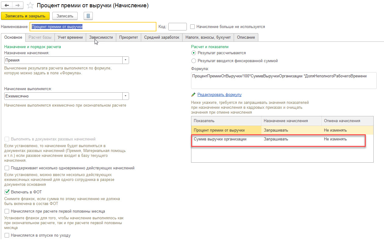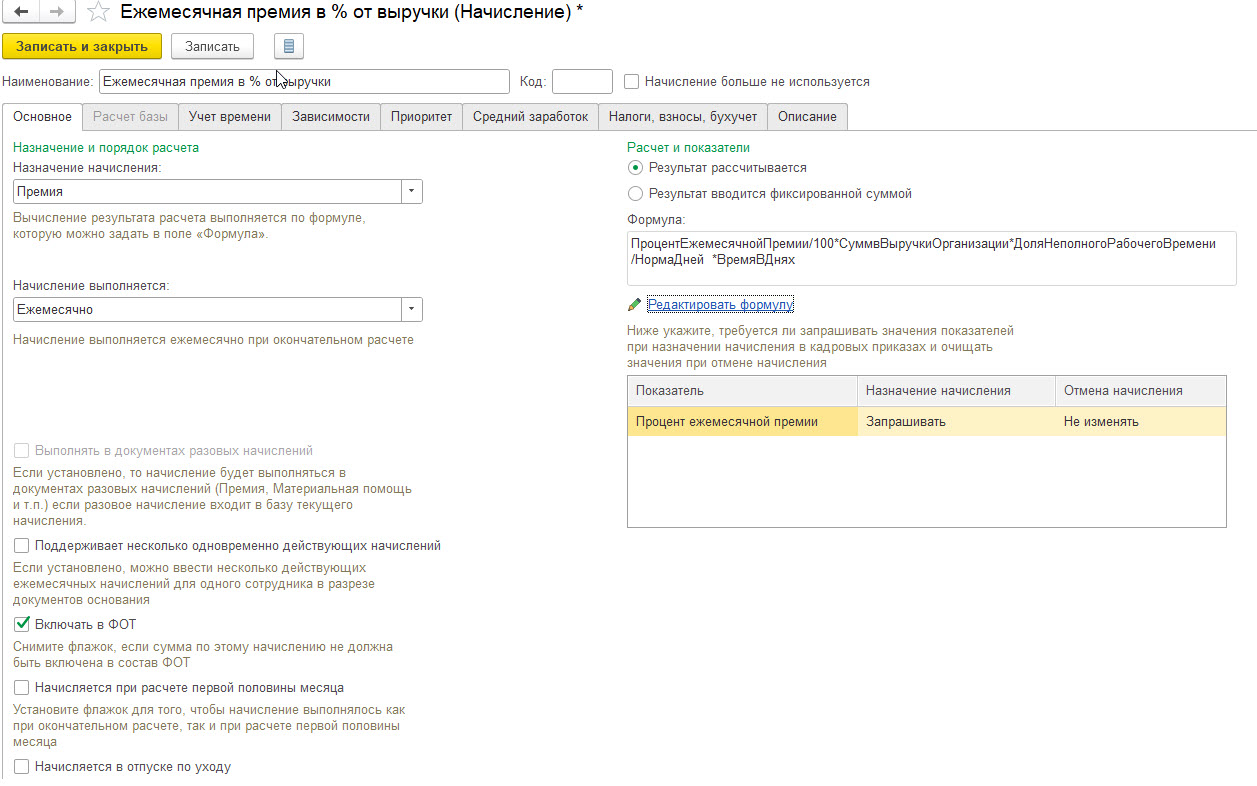 2) Создаем новое начисление (Настройки- Начисление). Можно сделать путем копирование предыдущего или повторить настройки. Нам нужно указать в формуле новый показатель, которые мы только что создали. Все остальные параметры не будет отличаться, только формула. Проверим, что установлен флажок Включать в ФОТ