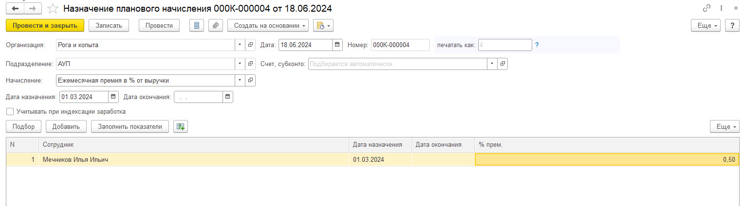 2) Назначаем новое плановое начисление и указываем процент. Удобно использовать документ Назначение планового начисления (Зарплата — Изменение оплаты сотрудников). Указываем с кого числа действует новое начисление и процент премии.