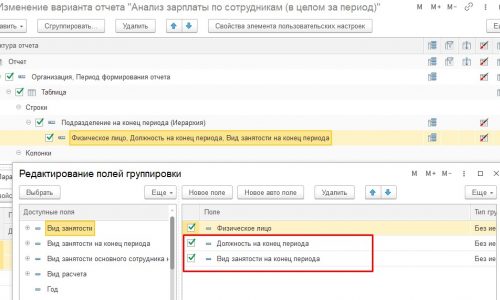 Добрый день! Подскажите, пжс, как донастроить отчет «Анализ з/п по сотрудникам» таким образом, чтобы после колонки списка сотрудников была колонка их должностей, а затем еще колонка с видом занятости. Спасибо.