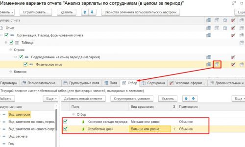 Хочу вывести сотрудников, у которых только есть отработанные часы в этом месяце и сальдо на конец 0 не получается (прикрепить свою настройку здесь не могу).
