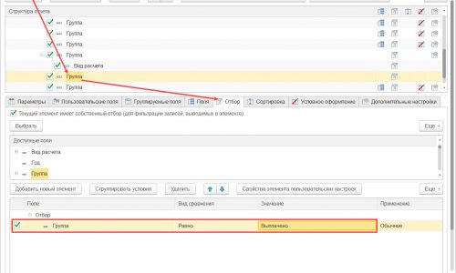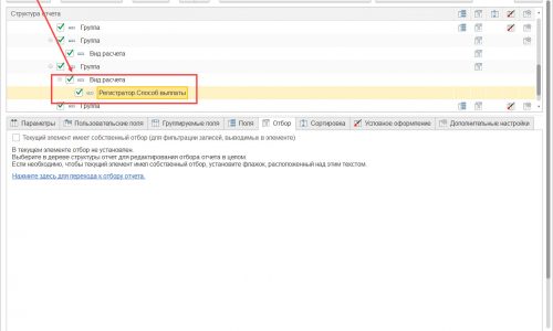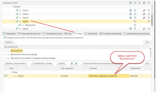 — в структуре отчета отдельно выделить группу «Выплачено» (сейчас она выводится вместе с группами Начислено, Удержано и Справочно). Для этого на уровне группы с отбором «Начислено, Удержано, Выплачено, Справочно» удаляем в отборе группу «Выплачено» и добавляем новую группировку по полю Группа. Для не в отборе уже ставим условие Группа = «Выплачено»
