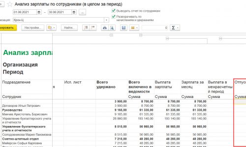 «Или ещё как вариант — можно использовать стандартный отчёт «анализ начисленной ЗП за месяц», там есть колонки по выплатам — аванс, зарплата, и межрасчётные выплаты. А можно детализировать эти межрасчёты? Отпускные/больничные/увольнения…»