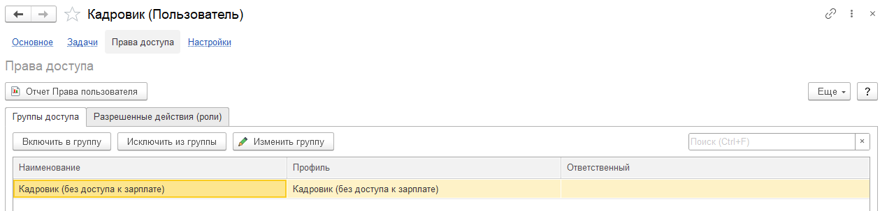Сейчас у пользователя установлены полные права. Необходимо нажать кнопку Исключить из группы, затем кнопку Включить в группу и указать группу «Кадровик (без доступа к зарплате)».
