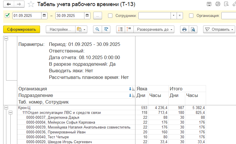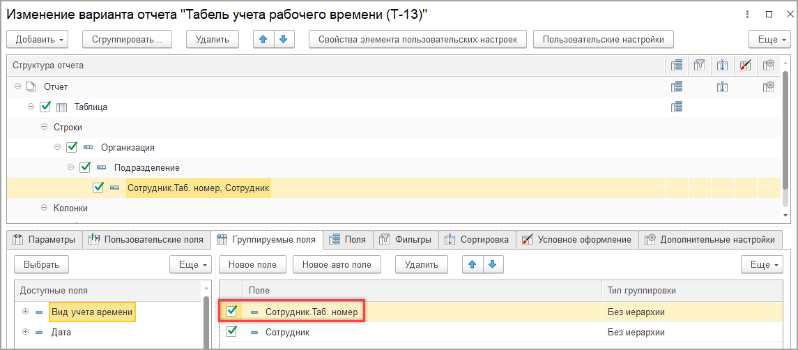 Правильно понимаю, что речь о том, чтобы в донастроенный отчет добавить колонку с Табельным номером.То есть речь об изменении настроек отчета Табель, который приведен в аналитический вид? На всякий случай прикладываю настройки табеля, которые приводят отчет в аналитический вид: Настройка отчета для анализа времени на основании типового отчета «Табель Т-13»