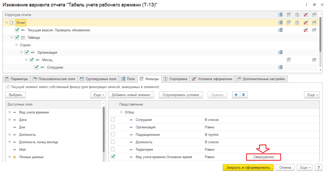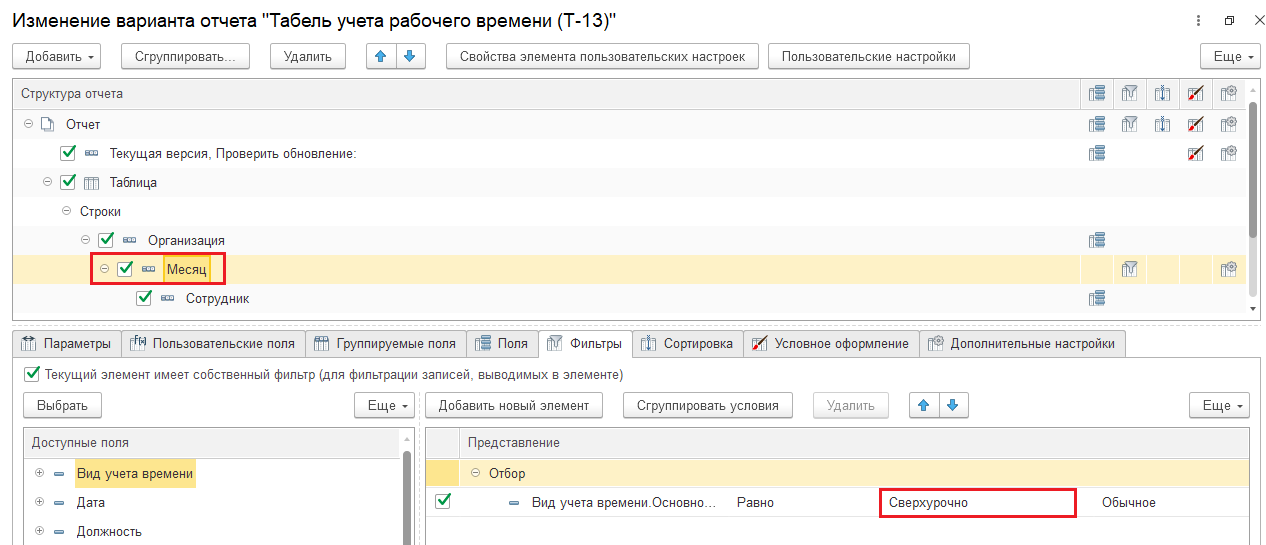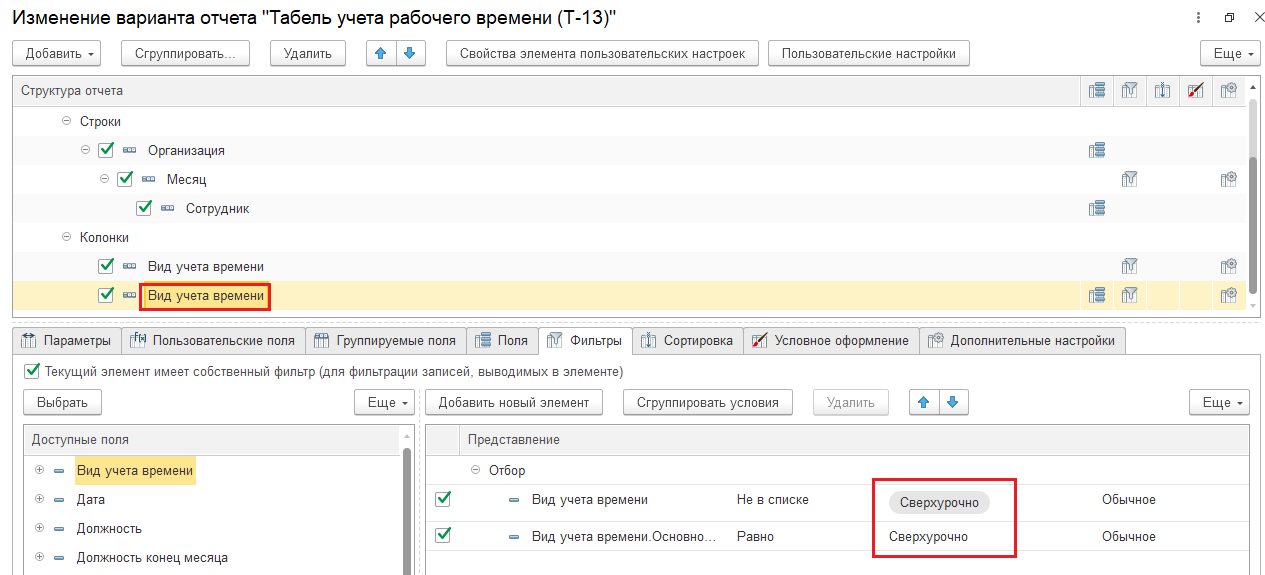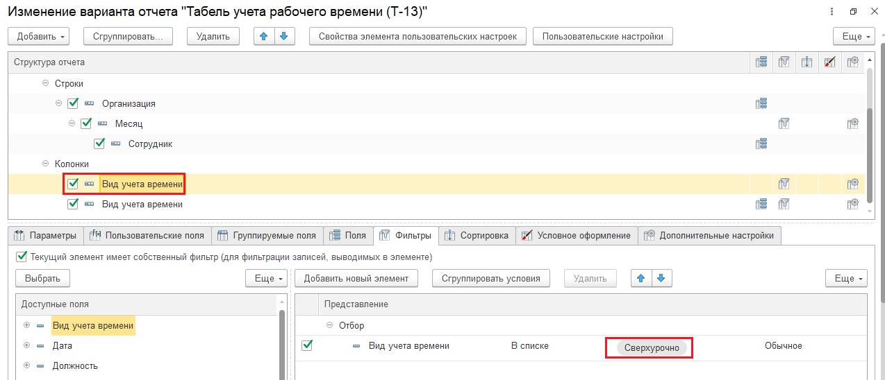 Добрый день! В отчете во всех отборах используется типовой вид времени Сверхурочно: