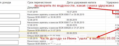 Насколько я вижу, несоответвует тут сумма дохода в строке 130: часть выплаченного дохода «ушла» в выплату 09.08. Это может быть потому, что неверно заполнена Ведомость на выплату — не верная расшифровка по документам основаниям.