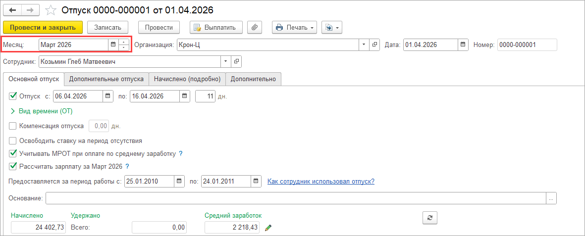 — если документ Отпуск первоначально начислили апрелем месяцем, а затем рассчитали зарплату за март.