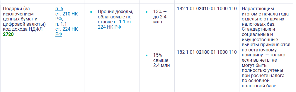 Код 2720 — применяется, если подарок в любой форме вручается налоговому резиденту и не относится к ценным бумагам. НДФЛ с подарка резиденту рассчитывается по ставкам: