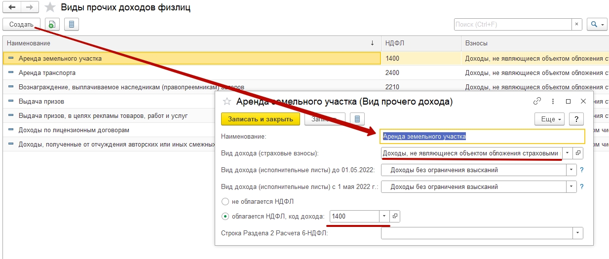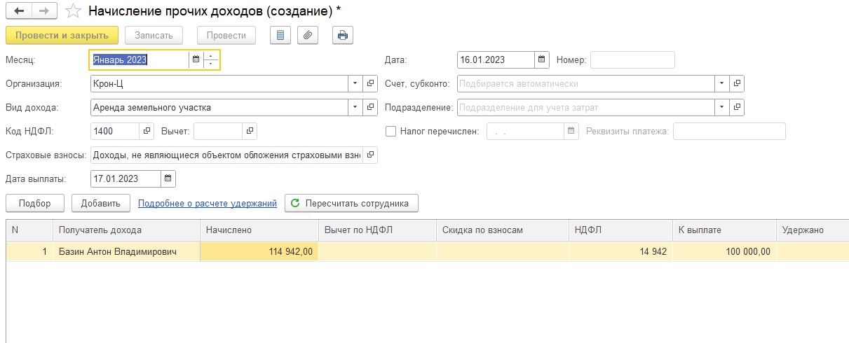 Физическое лицо, на время проведения наших строительно-монтажных работ, предоставил нам свой участок во временное пользование на определенный срок , заключили с ним соглашение о возмещение убытков на сумму 114943 , ему перечислили 100000 руб, НДФЛ -14943 за него перечислили. Этот доход должен отражаться в 6 НДФЛ за 2022, как в Зупе все это отразить, и в в бухгалтерии и какой код НДФЛ будет в таком доходе
