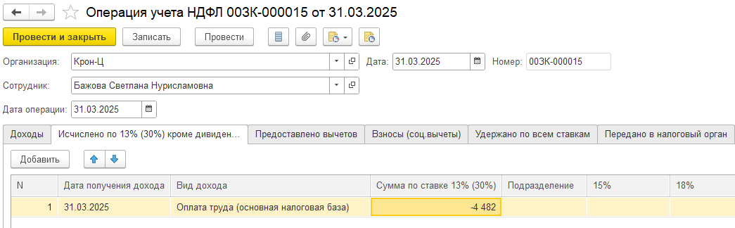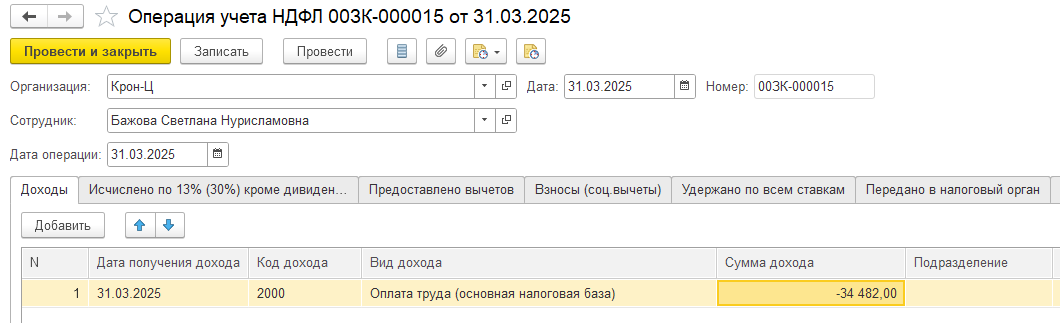 Можно ноябрем в документе Операция учета НДФЛ заполнить закладку Доходы, указав по коду 2000 — 65 533,93. Далее заполнить автоматически за ноябрь 2025 документ Перерасчет НДФЛ. Далее посмотрим как изменятся суммы НДФЛ после перерасчета.