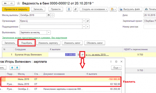 Здравствуйте! В данном случае добавлять сотрудника в ведомость можно по кнопке «Подбор», удалив лишние записи, оставив сумму аванса и зарплаты. Пример на скриншоте (без аванса, только зарплата за октябрь). По корректировке суммы к выплате есть статья на нашем сайте — Как правильно корректировать сумму к выплате в ведомости при частичной выплате дохода? .