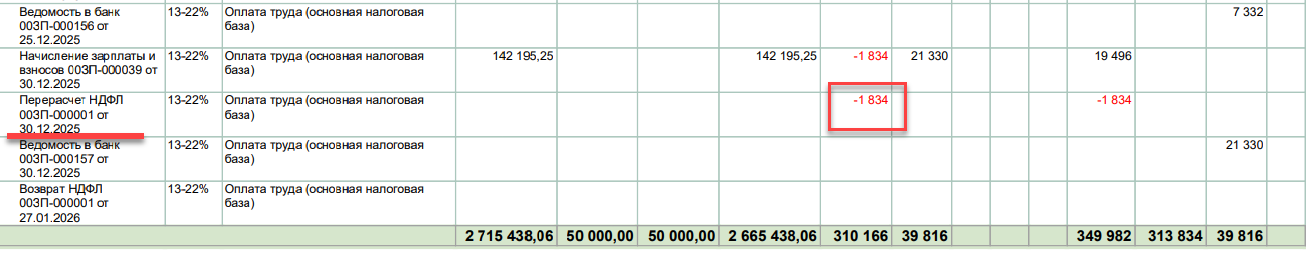 Добрый день! да, выполнила перерасчет январем 2026 за 2025 год- вылез опять этот ндфл по Карасеву на ту же сумму 1834