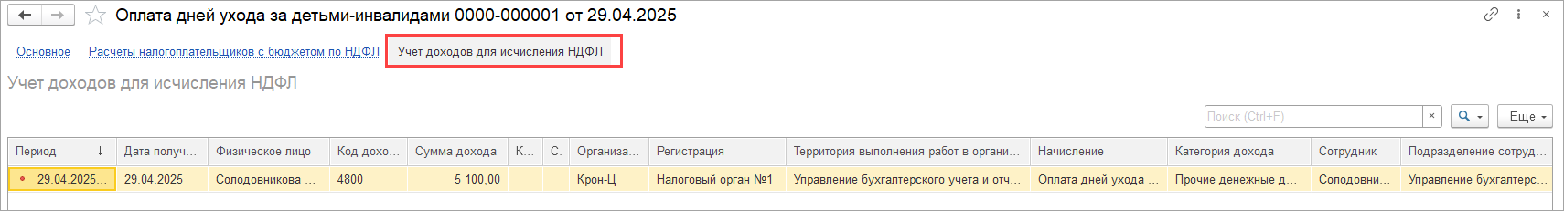 В результате мы увидим данные регистра Учет доходов для исчисления НДФЛ из документа Оплата дней ухода за детьми-инвалидами, например: