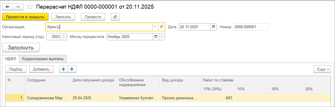 3. Далее, чтобы сторнировать исчисленный НДФЛ по оплате дней ухода за детьми-инвалидами создадим документ Перерасчет НДФЛ и заполним — НДФЛ по сотруднику пересчитается, например: