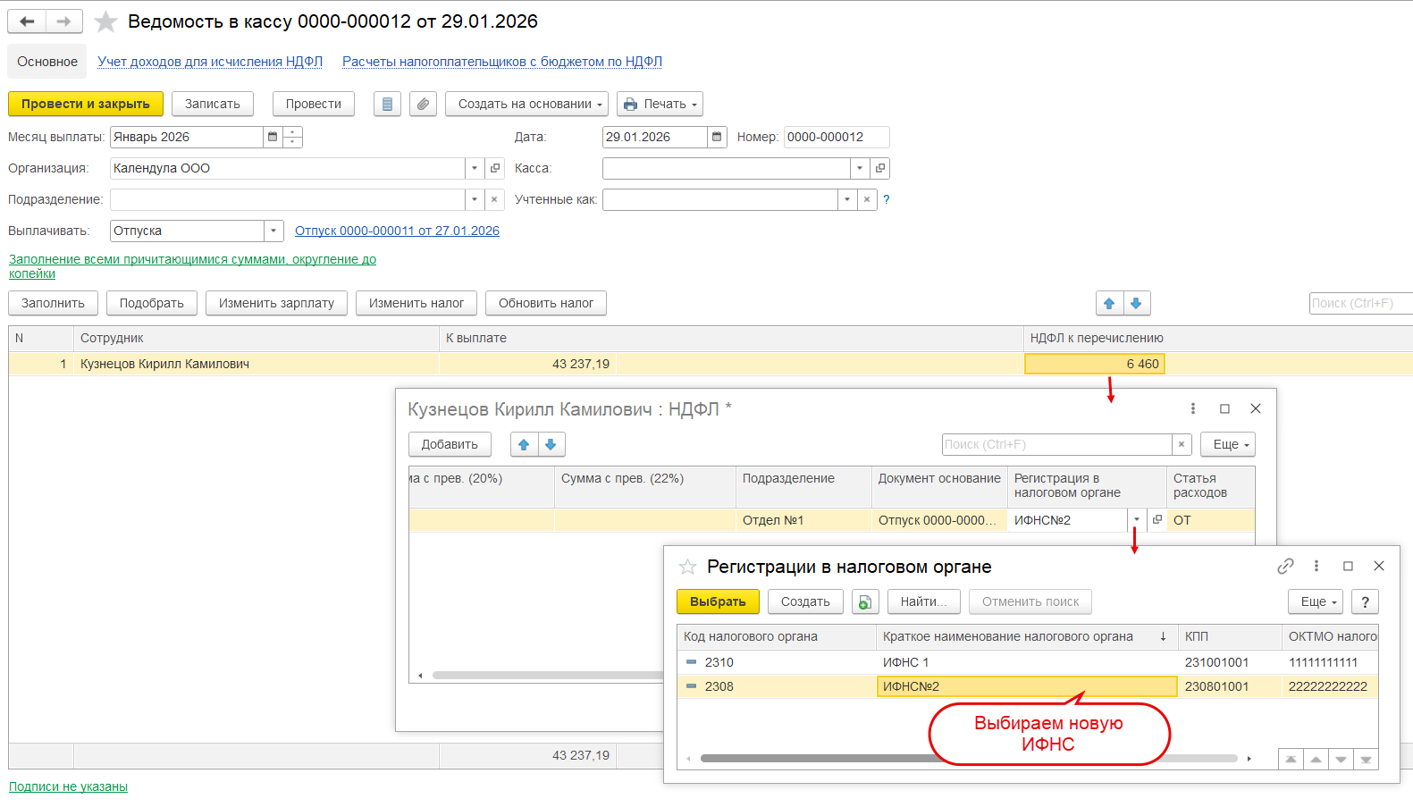 Чтобы поменять регистрацию ИФНС по выплате для Отпуска №2 и Премии — в Ведомостях на выплату от 29/01/2026 меняем регистрацию ИФНС для колонки НДФЛ.