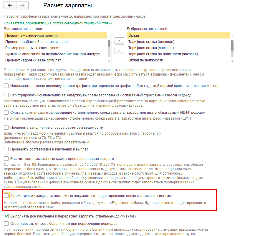 Ведомости могут быть заблокированы, если стоит защита от блокировки после выгрузки в банк, тогда сначала снимаем флажок в настройках расчета зарплаты (Настройка – Расчет зарплаты). А после исправления возвращаем его назад.