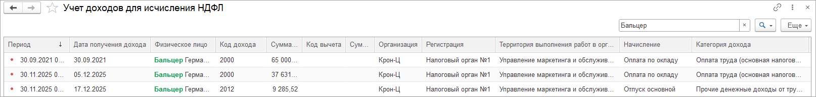 1. Сначала посмотрим движения по регистру Учет доходов для исчисления НДФЛ, с отбором по сотруднику, которые в дальнейшем нам нужно сторнировать.
