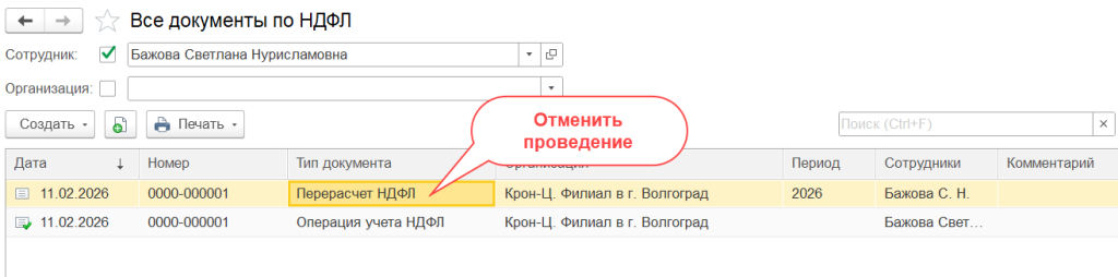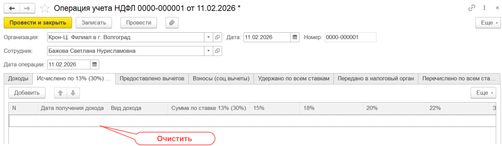 Потом в Операции учета НДФЛ очистим вкладку Исчислено по 13% (30%) кроме дивидендов, сторно налога нам больше не нужно. Таким образом исчисленного НДФЛ с больничного у нас не будет ни в НУ, ни в БУ.