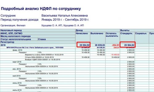 Прилагаю скрин из Вашего отчета: сумма 20584,92 — сумма полчнного дохода и = сумме полученных вычетов. Сумма 20839,83 — это неверная сумма выплаченного дохода,которая возникла из-зп некорректного заполнения Ведомости.