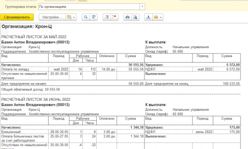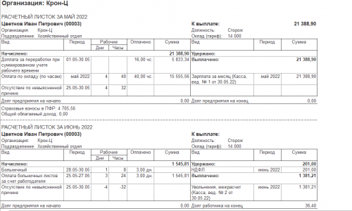 Сотрудник болел с 25-30 мая, был введен документ «Отсутствие (больничный еще не закрыт)». Начислена зарплата за май, все посчиталось верно с учетом отсутствия.