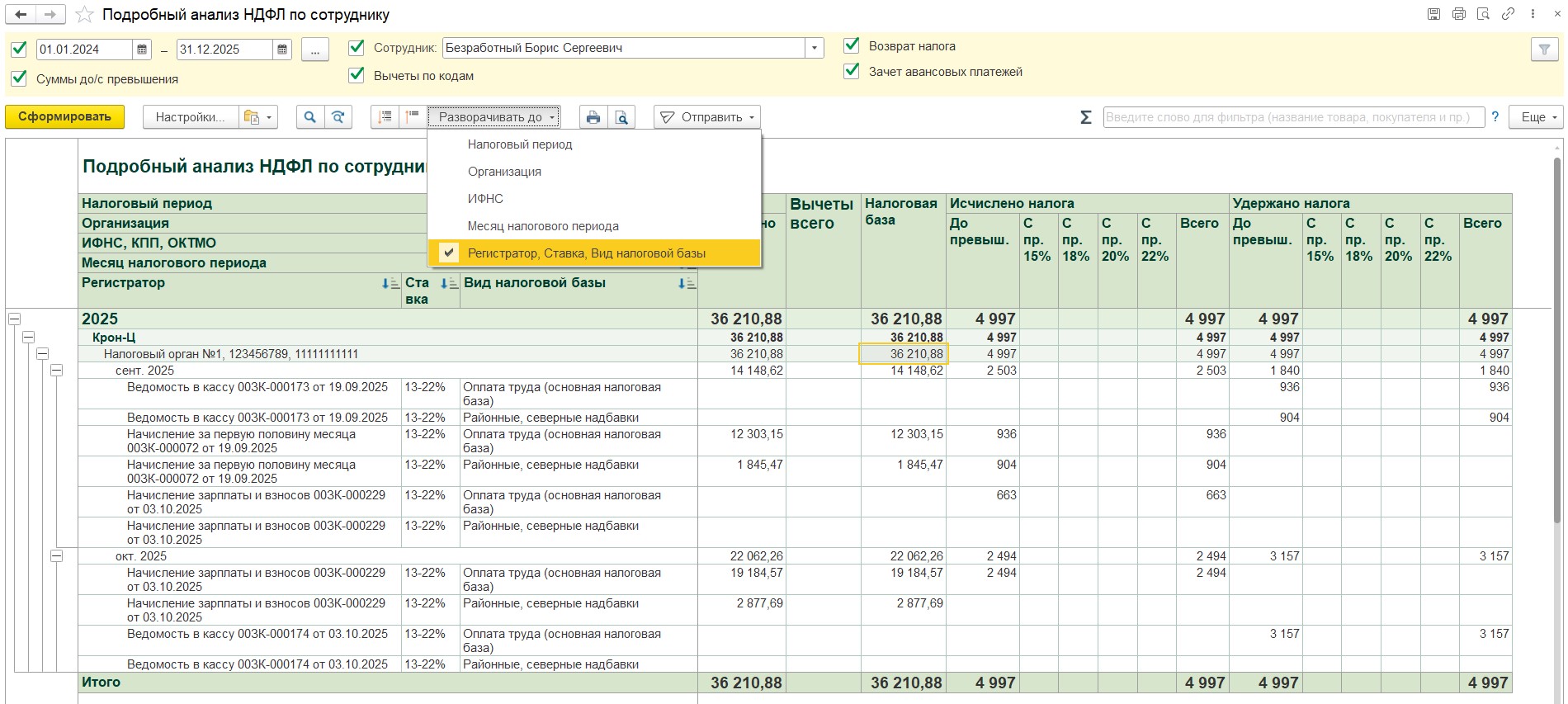 В Августе была начислена зарплата за месяц. В самом начислении все корректно, но в анализе НДФЛ не отображается сумма дохода и налога по РКСН. Сразу не заметили, увидели только сейчас при анализе другой ситуации, а именно: