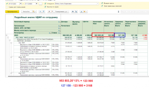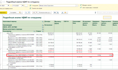 Добрый день! Пришлите, пожалуйста, скриншот отчета «Подробный анализ НДФЛ по сотруднику» за период с 01.01.23 по 31.12.23, возможно есть излишне удержанный НДФЛ, поэтому НДФЛ в ведомости не появляется.