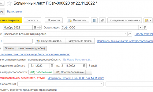 В этом же месяце появился больничный с 15.11.2022 по 21.11.2022. При проведении программа предупредила о текущем отклонении — отпуск, однако перерасчет не произвела. Сейчас сотруднице начислен и выплачен отпуск и проводится оплата больничного. Заглянули в декабрь — и там корректировки нет. Почему?