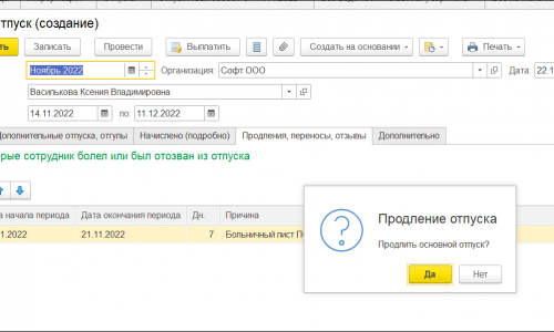 Воспроизвела на демо-базе. Программа предложила исправить и продлить отпуск. Добавила скрины.
