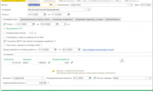 Сегодня создал новый отпуск для другого сотрудника. Создал для него больничный. Все в ноябре. Автоматический пересчет сработал. Перерасчет произведен правильно.
