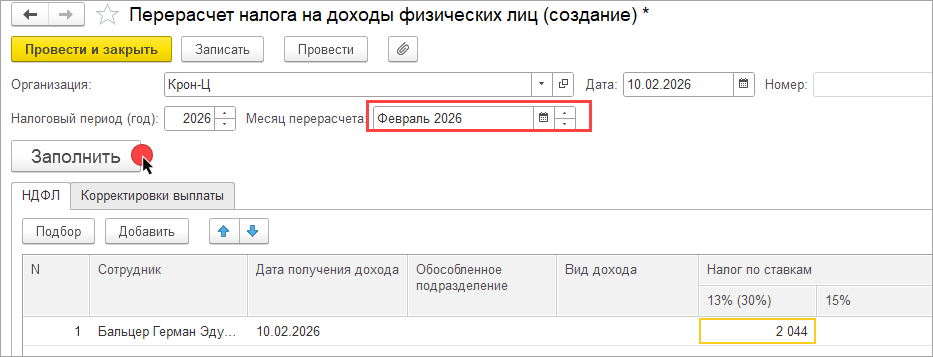 3. Чтобы исправить исчисленный НДФЛ в НУ и БУ создадим документ перерасчет НДФЛ за февраль. И заполним — ожидаем, что автоматически подтянется сумма НДФЛ + 2044. Теперь НДФЛ отразится в НУ и БУ т.к. документ Перерасчет НДФЛ делает движения в регистрах НУ и БУ.