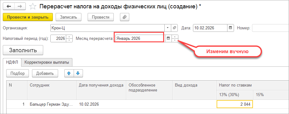 4. Меняем месяц в документе перерасчет НДФЛ на январь 2026 (документ Перерасчет НДФЛ не пересчитываем, просто меняем месяц), чтобы исчисленный НДФЛ увеличился правильно в расчетном листке января 2026.