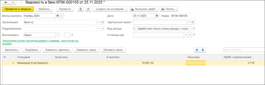 Добрый день! В ноябре сотруднику была начислен аванс и выплачен корректно, начислена заработная плата, но в зарплатной ведомости сумма отразилась как будто сотрудник не получил аванс, то есть была выдана вся сумма за месяц за минусом НДФЛ и алиментов. Заметили ошибку только при начислении аванса за декабрь и формировании ведомости. Сейчас сформировала предварительно начисление за декабрь и ведомость по выплате зарплаты за декабрь, программа опять к выплате ставит полностью заработную плату за минусом алиментов и НДФЛ. Подскажите, пожалуйста, в чем ошибка? До ноября таких проблем не было…