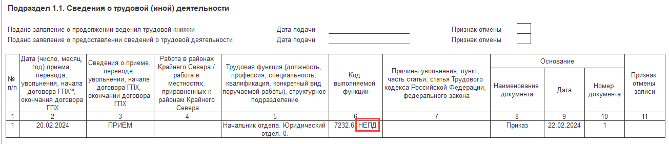 Дополню, ч то Сотрудник Дюдин был принят 21.01.25 года на неполный рабочий день на пол ставки основное место работы.Т.е. он не совместитель, поэтому по нему код НЕПД указываем. Если бы сотрудник был совместителем (как Алферьева был принят 20.02.24 года на неполный рабочий день на пол ставки внешнее совместительство), то код НЕПД не заполняем. Подробно об этом рассказывали здесь: Коды «НЕПД» или «НЕПН» в ЕФС-1 при трудоустройстве совместителя не указываются