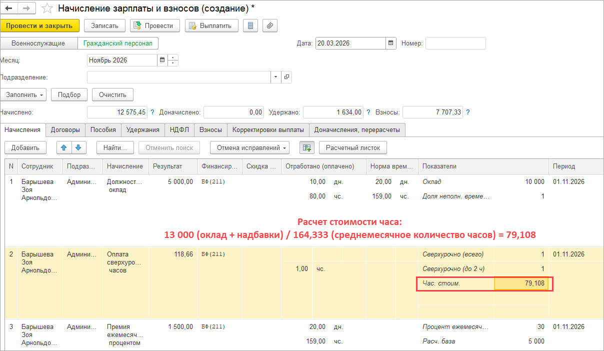 Формула будет такой: фот (плановые начисления) / среднемесячное количество часов за год * ПоказательЧасов (мы его будем заводить сами через данные расчета зарплаты.