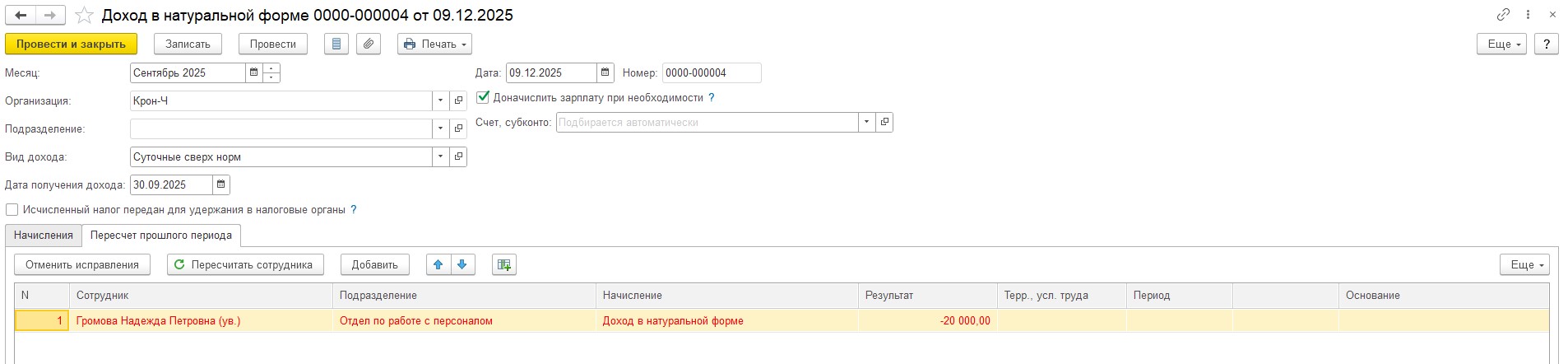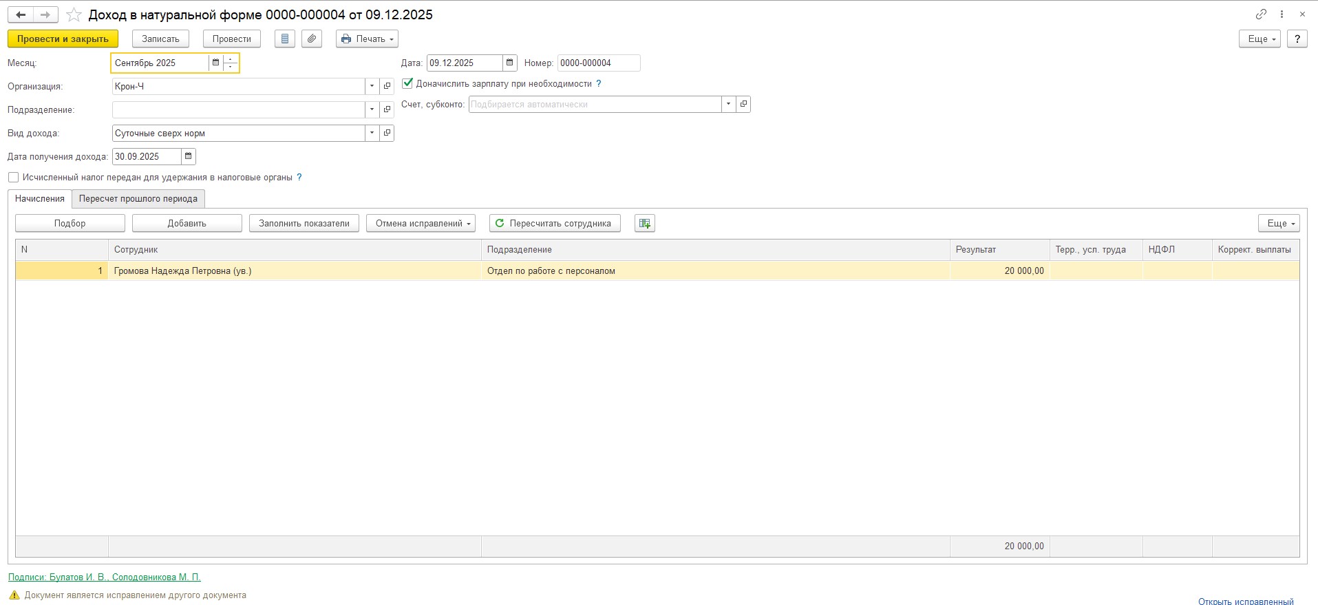 У меня такая ситуация. Во втором квартале отражала суточные сверх. норм. Ошибочно выбрала другой вид начисления по натуральным доходам. Ошибка заметила только в третьем квартале. Сделала документ исправление.