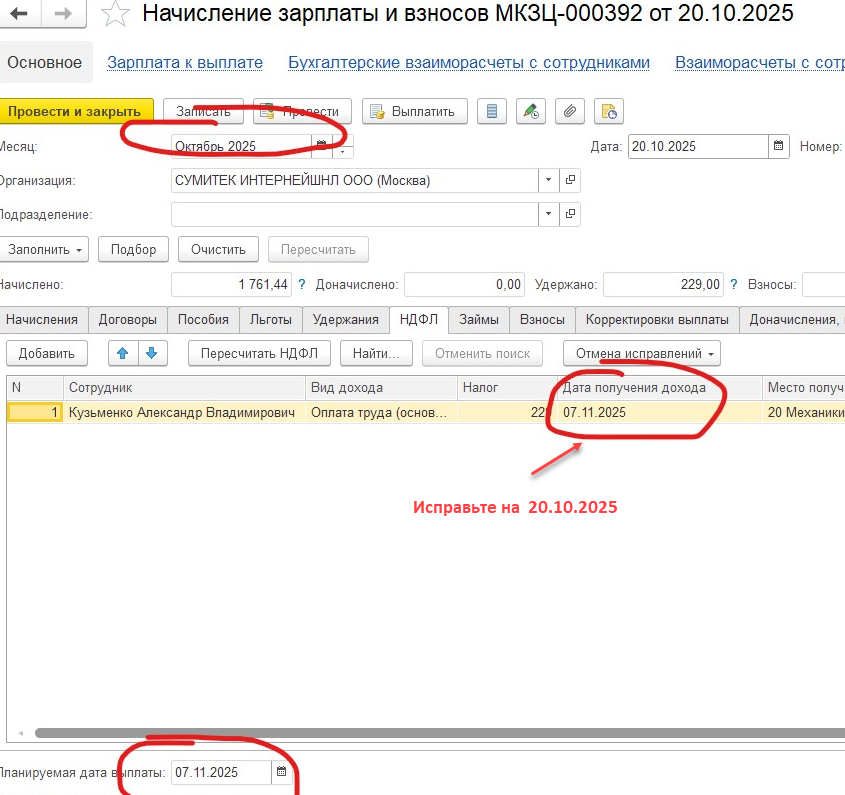 ДАТА ПОЛУЧЕНИЯ ДОХОДА на закладке НДФЛ — 20.10.2025 (дата выплаты аванса октябрьского за 25 год)