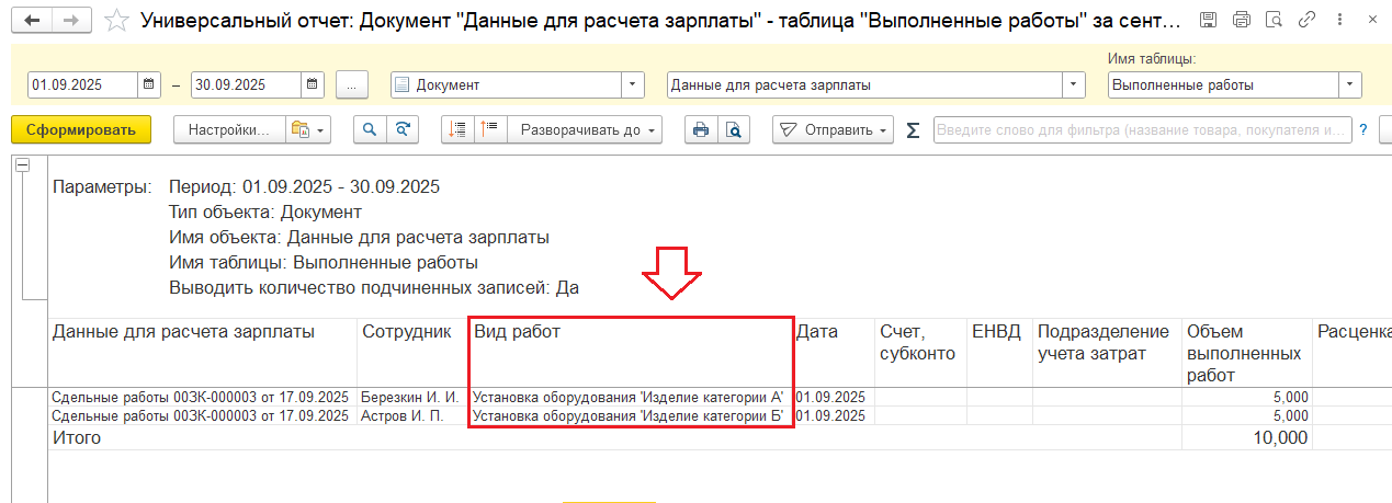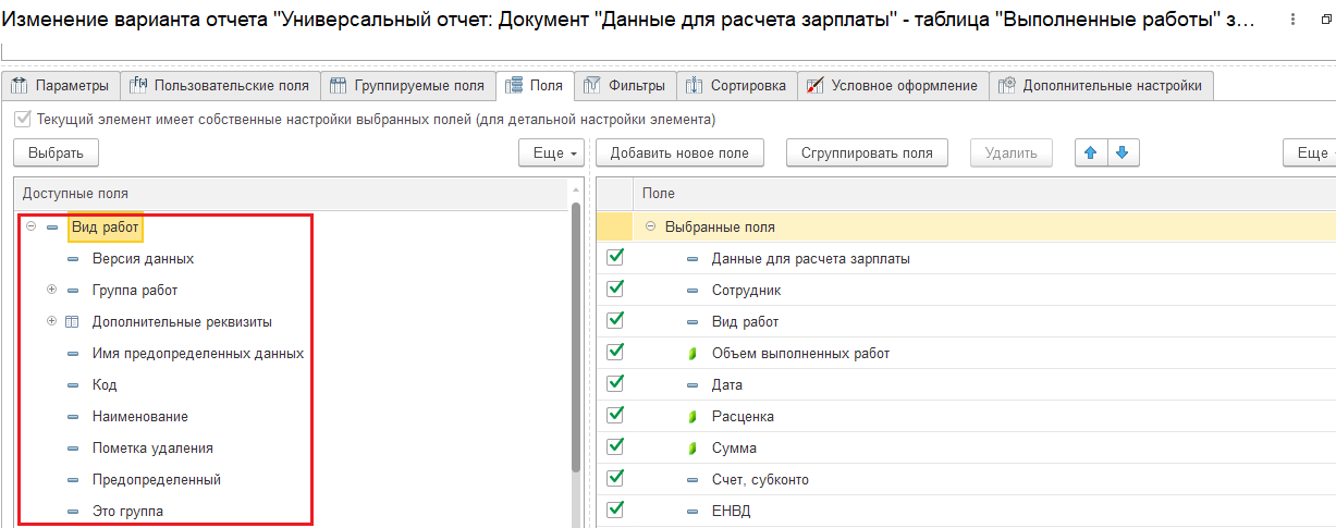 Дело в том, что в данном случае нам нужно формировать Универсальный отчет по документу Данные для расчета зарплаты с отбором по табличной части Выполненные работы. Но проблема в том, что счет учета скрыт в поле Вид работ и мы его не можем вывести в отчет.