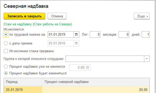 Здравствуйте! Тут вопрос в том, как задать изменение процента надбавки. Если в форме указать, что процент меняется с определенной даты, то наша надбавка будет разбиваться по периодам. Скриншот прилагаю. (РК установила равным единице для наглядности).