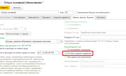 Данное распределение настроить можно, но нужно будет вести учет по статьям финансирования. Учет по статьям финансирования включается в разделе Настройка — Расчет зарплаты. После этого в начислении «Отпуск основной» станет доступна настройка «По базе среднего заработка» на закладке Налоги, взносы, бухучет. Пример распределения разобран в публикации на нашем сайте — Как настроить автоматическое распределение отпуска по статьям финансирования? .
