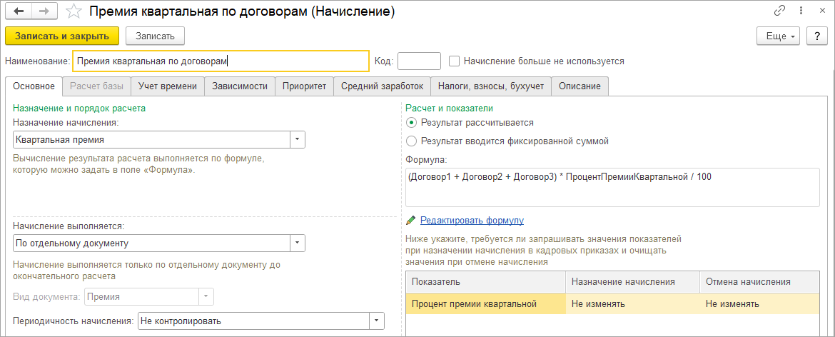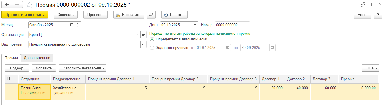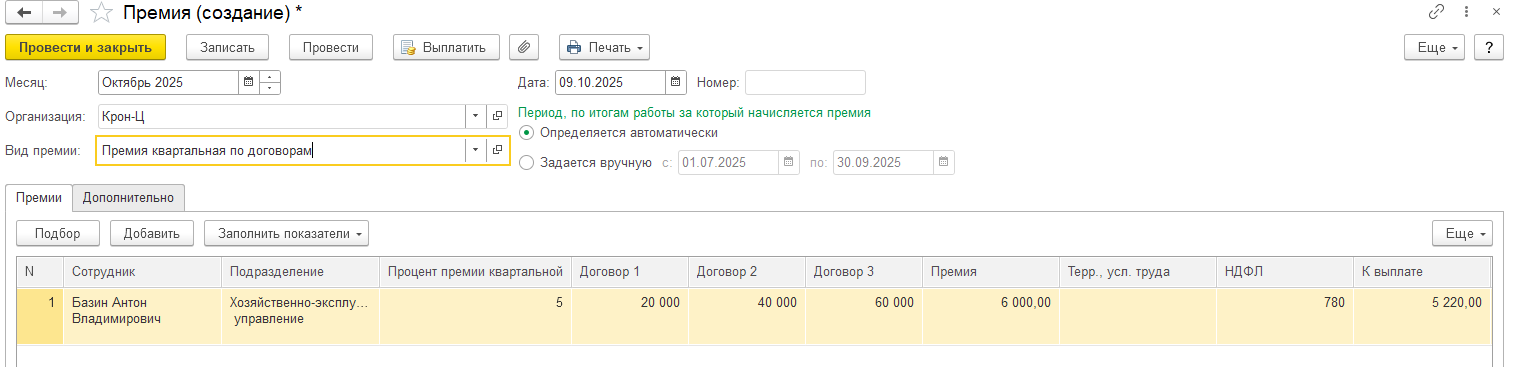 Добрый день, совсем запуталась с настройкам ежеквартальных премий сотрудникам : начисляются сотрудникам- менеджерам продаж по видам трем договоров — показатель сумма (разные) договоров за квартал : договорА =10000, договор В=20000, договор С 30000, причем у каждого сотрудника по этим видам договоров разные проценты. как правильно настроить, какие показатели, и в одном документе.