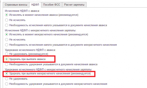 Здравствуйте! Если у Вас ЗУП версии 3.1.11 и выше, то необходимо проверить настройки учетной политики по удержанию НДФЛ с аванса (раздел Настройка — Организации — Учетная политика, закладка НДФЛ). Подробнее про это изменение в программе — Исчисление и удержание НДФЛ с аванса и межрасчетных зарплатных доходов (ЗУП 3.1.11) .