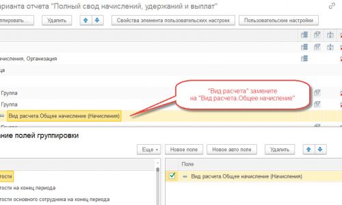 В настройках отчета «Полный свод» поле «Вид расчета» замените на «Вид расчета.Общее начисление (Начисления)» (скриншот прилагаю).