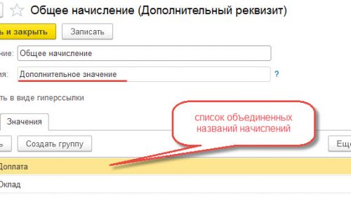 Затем в начислениях на вкладке «Дополнительно» выберите внесенные значения объединенных названий начислений.