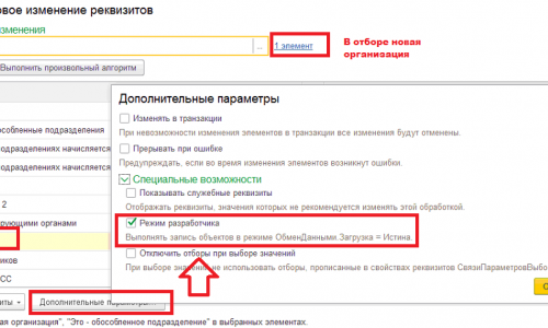 Здравствуйте! Можно воспользоваться обработкой «Групповое изменение реквизитов» — Групповая обработка справочников и документов в 1С 8.3 . Раздел Администрирование — Обслуживание — Корректировка данных — Групповое изменение реквизитов. В отборе указать Организацию-филиал. Поставить Это-Обособленное подразделение -Да и указать Головную организацию, чтобы настройки прошли необходимо установить галочку «Режим разработчика» в Дополнительных параметрах. Отменить настройки можно тем же путем.