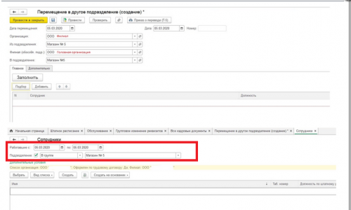 Добрый день! Да, результат тот же. Сотрудники появились после изменения у сотрудников филиалов реквизита «Головная организация» на организацию, в которую нужно осуществить перевод и перепроведения документов «Начальная штатная расстановка» (01.0.1.2020 был переход с зуп 2.5. на 3.1), «Кадровый перевод» и «Прием на работу». После этого в документ «Перемещение в другое подразделение» попали все сотрудники филиала и провелся без проблем. У новых сотрудников для больничного и отпуска теперь нет среднего заработка.