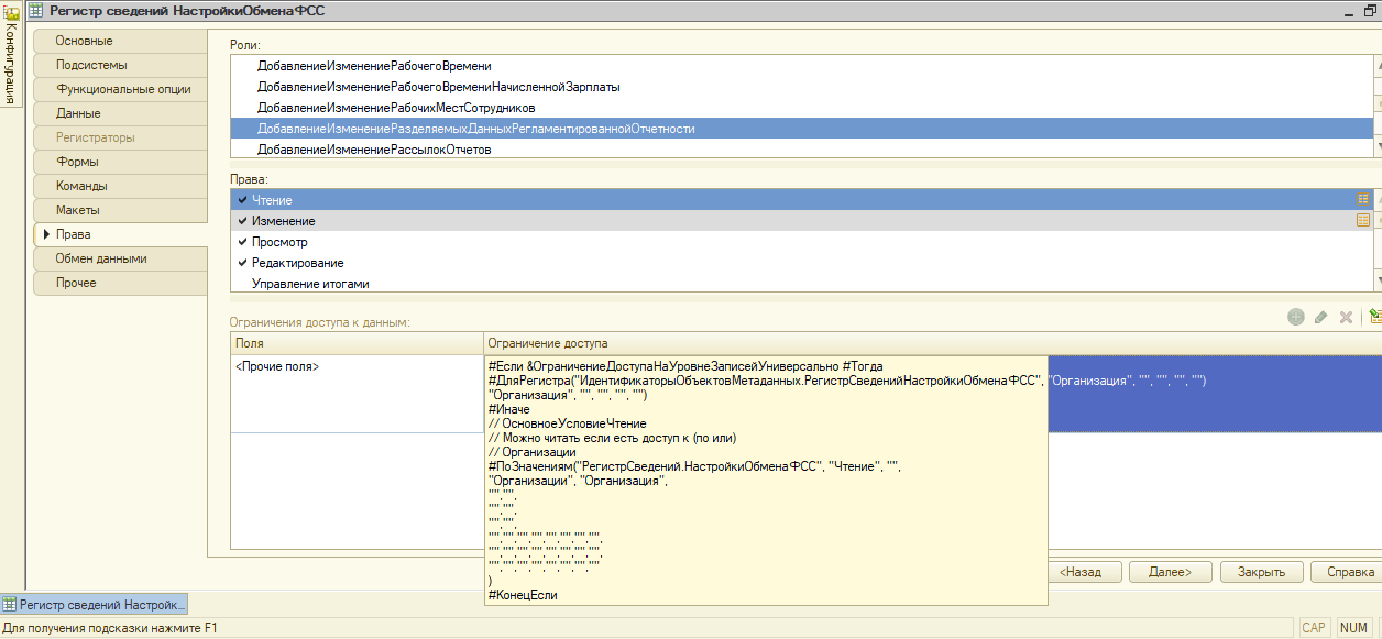 Добрый день! При открытии формы проверяются права на регистр сведений Настройки обмена с СФР (бывш. ФСС).